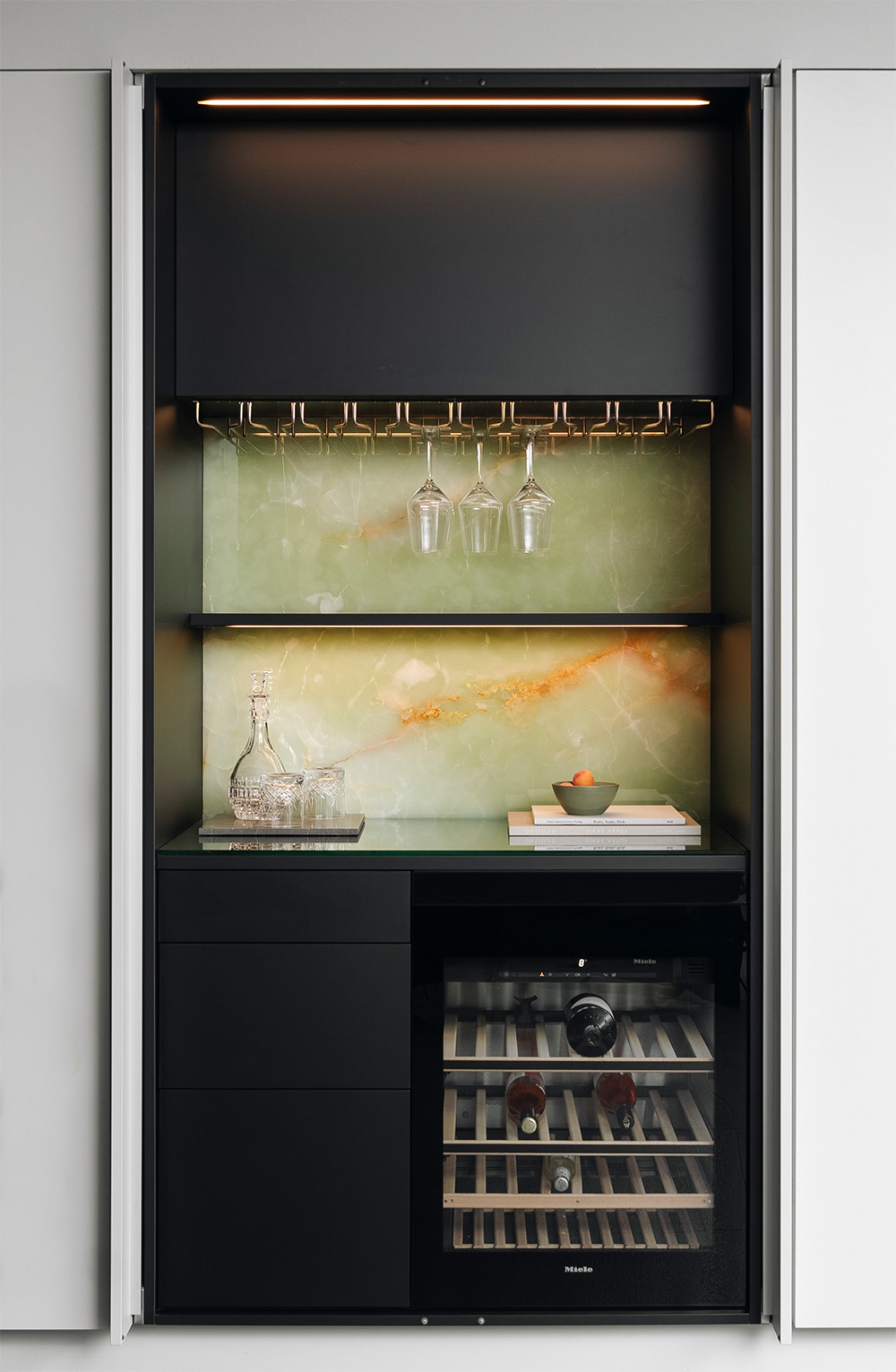 Seamlessly built into our showcase cabinets, the ONE A Wine combines luxury wine storage with minimalist design aesthetics. The system harmonizes with delicate 25 mm door frames and a selection of glass fronts – from clear to tinted bronze, anthracite, or deep black – offering an unobstructed view of your wine collection. Integrated indirect lighting enhances the cabinet’s sculptural presence, transforming wine storage into an elegant design statement