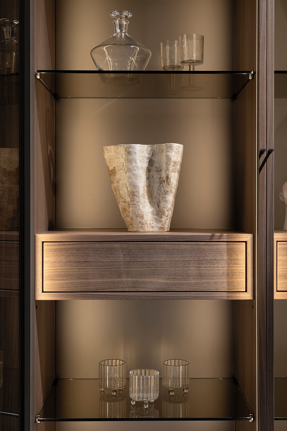 Als een glazen schatkist biedt het Showcase-assortiment een veilige ruimte voor speciale objecten. Kleine collecties en bijzondere vondsten vinden onder subtiele ledverlichting hun plek achter glazen deuren. Verschillende frames met doorlopende handgrepen benadrukken het heldere karakter van de presentatie of spelen een subtielere rol in het geheel. Afhankelijk van het gekozen glas kunnen de objecten ook geheel worden verborgen of subtiel hun silhouet tonen tegen de achterwand. De vitrines zijn verkrijgbaar in verschillende hoogten.