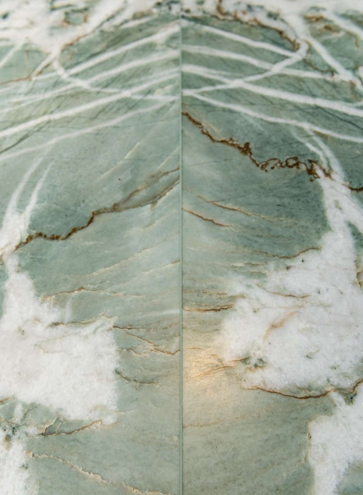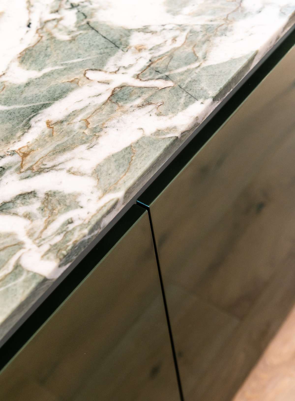 Aquarzo natuursteen, in zachte en harmonieuze groene en grijze tinten, geeft de keuken nog meer allure. Het siert zowel de uitgestrekte werkbladen als de zwevende kasten die naadloos overgaan in de aangrenzende woonkamer.
